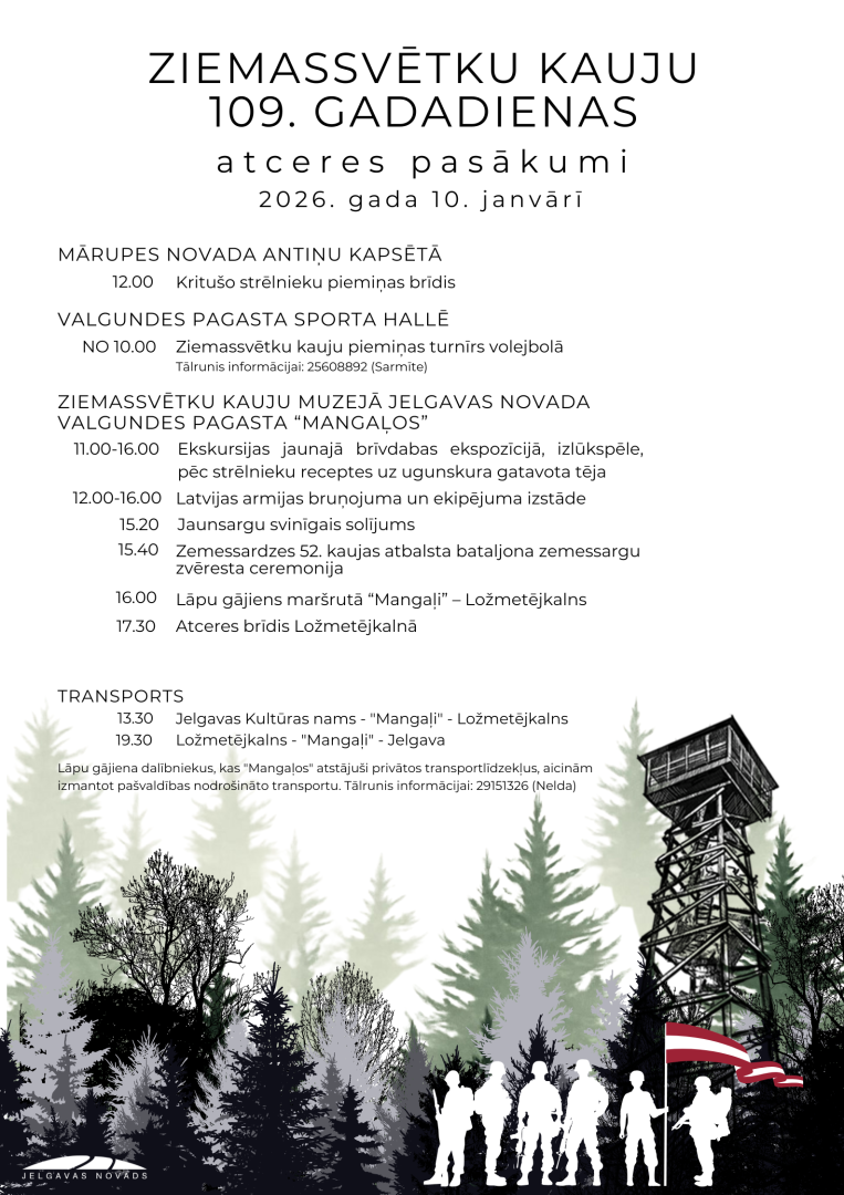 Atzīmējot Zie­massvētku kauju 109. ga­dadienu un godinot kaujās kritušo strēlnieku piemiņu, Jelgavas novada pašvaldība 2026. gada 10. janvārī aicina uz pasāku­miem, kas veltīti vēsturiskā notikuma atcerei.