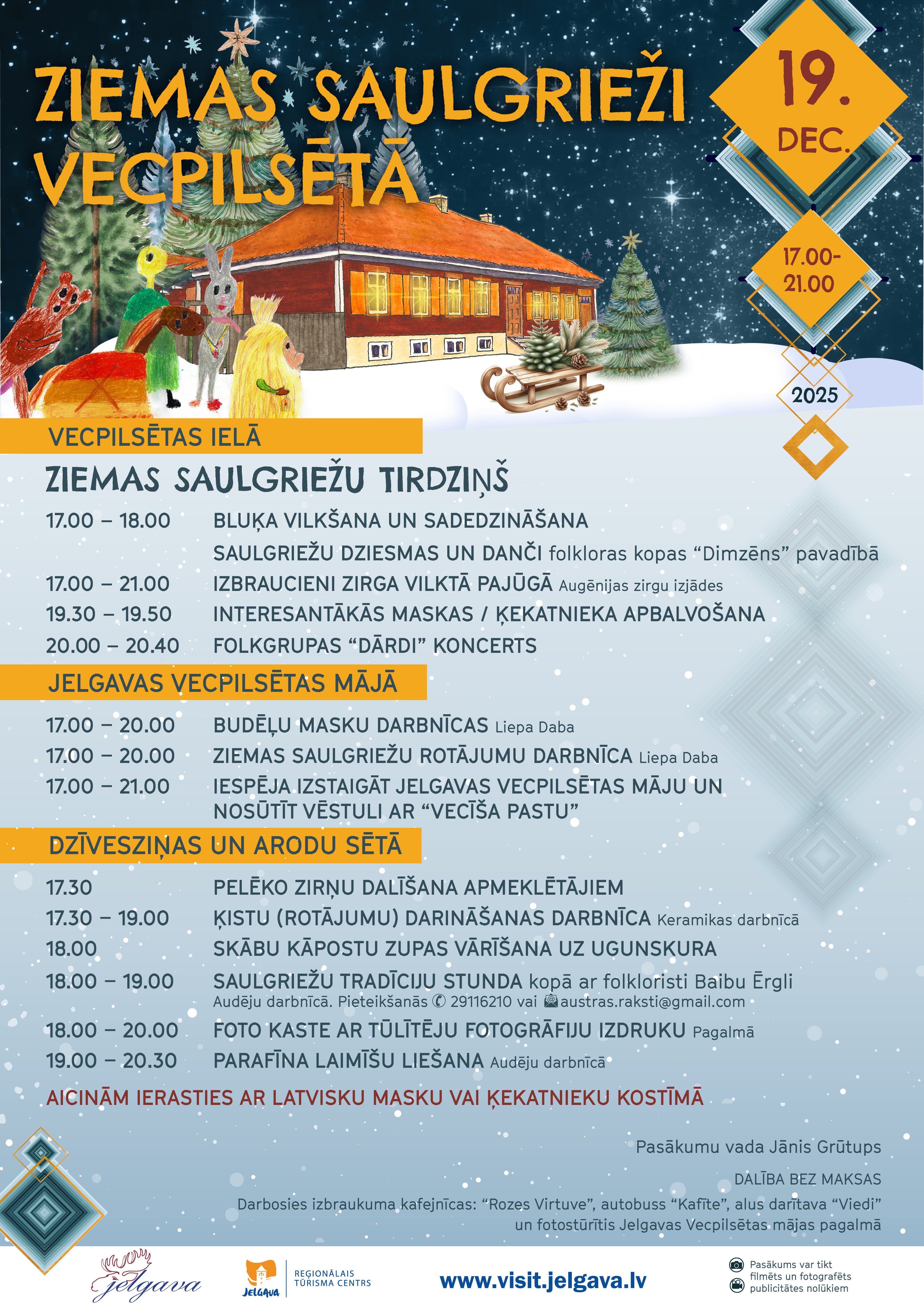 Vecpilsētas iela izrotāta lampiņu virtenēm, skaisti rotāta lielā svētku egle un fotostūrīša kamanas Jelgavas Vecpilsētas mājas pagalmā. Būs dziesmas un danči folkloras kopas “Dimzēns” pavadībā, bluķa vilkšana, budēļu masku, ķistu un ziemas saulgiežu rotājumu darbnīcas, kā arī parafīna laimīšu liešana. Ikviens varēs uzzināt ko jaunu par ziemas saulgriežu tradīcijām no folkloras zinātājas Baibas Ērgles, nobaudīt pelēkos zirņus un palīdzēt vārīt skābu kāpostu zupu uz ugunskura. Pasākuma apmeklētājiem būs unikāla iespēja izbraukt zirga vilktā pajūgā! Pasākuma laikā būs atvērts mājražotāju un amatnieku tirdziņš, darbosies foto kaste ar tūlītēju fotogrāfiju izdruku. Pasākumu noslēgs folkgrupas “Dārdi” koncerts, bet visu pasākumu vadīs jelgavnieks Jānis Grūtups. Visas pasākuma aktivitātes būs bez maksas. Pasākuma apmeklētāji aicināti parūpēties par ziemas saulgriežiem atbilstošu izskatu un uz pasākumu nākt latviskās budēļu maskās, un ķekatnieku kostīmos, jo interesantāk un krāšņāk tērptie dalībnieki tiks apbalvoti!