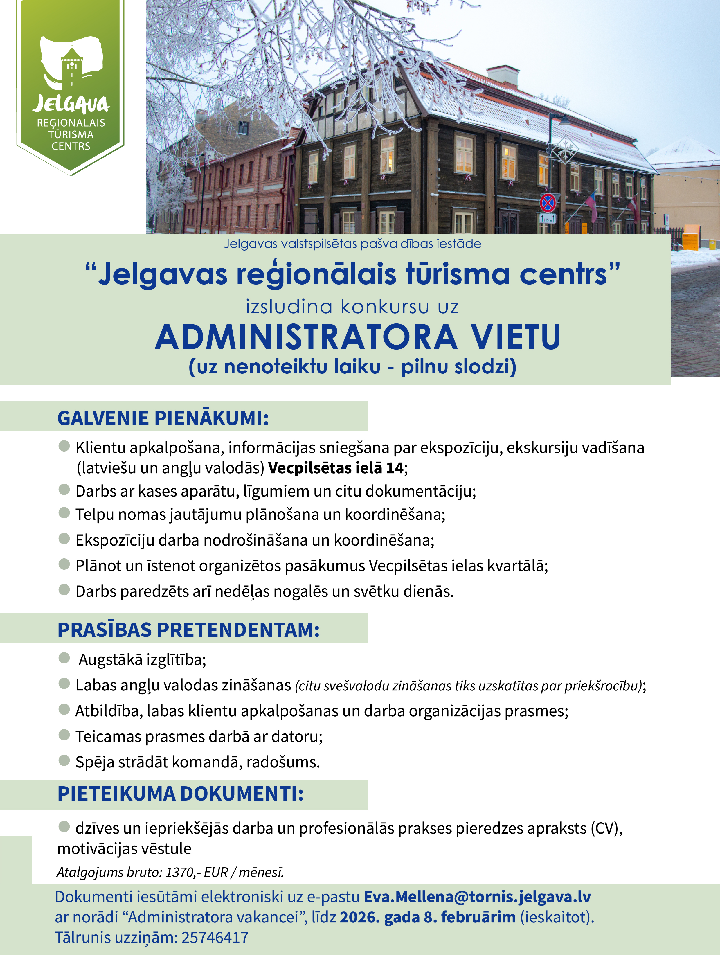 Jelgavas reģionālais tūrisma centrs izsludina vakanci uz administratora vietu