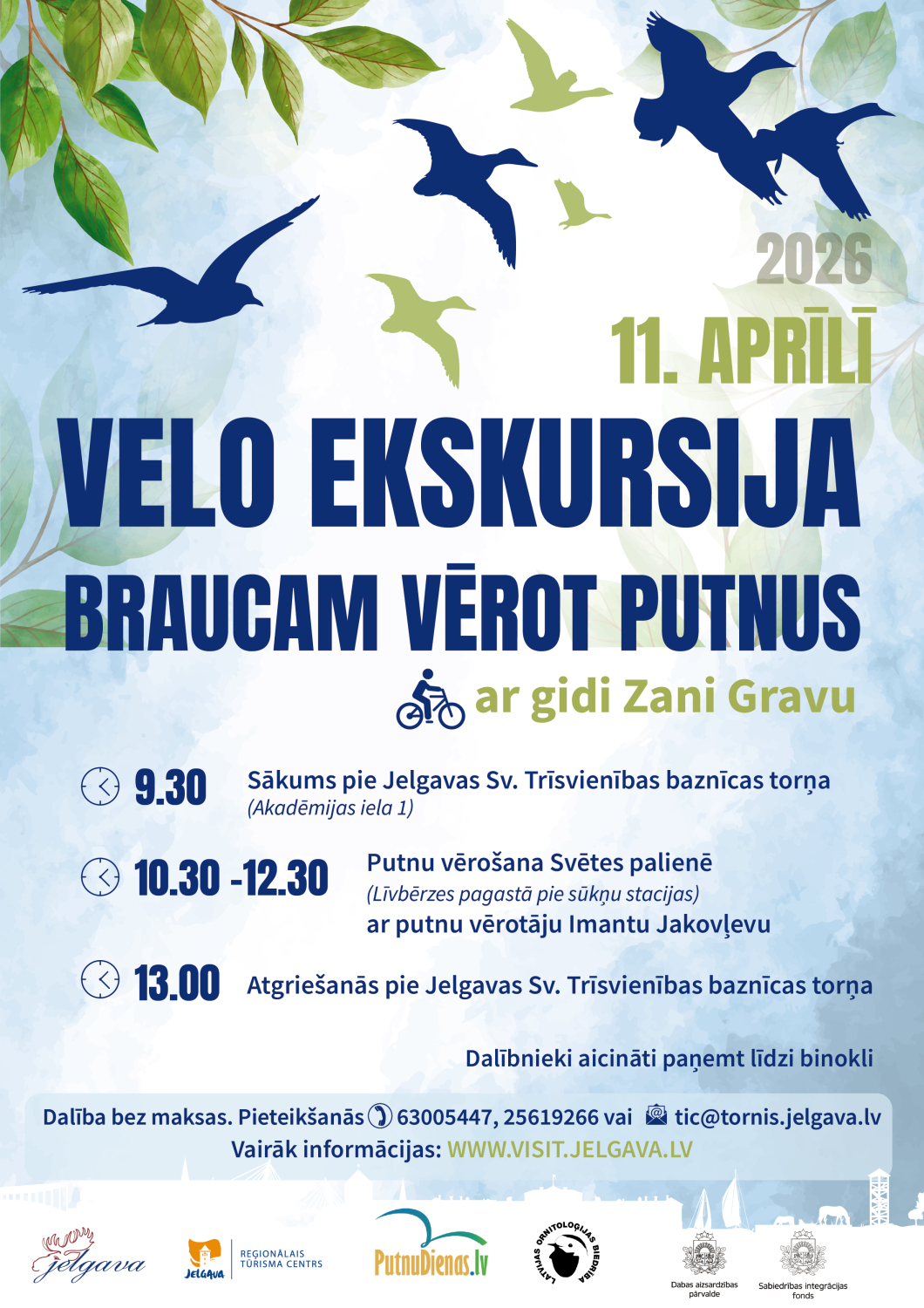 Sestdien, 11. aprīlī, pulksten 9.30, Jelgavas Sv. Trīsvienības baznīcas torņa pagalmā sāksies velo ekskursija “Braucam vērot putnus”. Gides Zanes Gravas pavadībā dalībnieki dosies uz Svētes palieni, kas ir nozīmīga migrējošo ūdensputnu un bridējputnu barošanās vieta. Pavasarī šeit novērojami zosu bari, pīles, gulbji, dzērves. Svētes palienē ekskursijas dalībniekus sagaidīs pieredzējis putnu pazinējs – ornitologs Imants Jakovļevs, kurš pastāstīs par palienē sastopamajām putnu sugām, to dzīvesveidu, kā arī to, kāpēc ik gadu simtiem gājputnu izvēlas atpūsties tieši Svētes palienes pļavās. Velo ekskursijas garums ir 25 kilometri. Ceļā ekskursijas dalībnieki varēs uzzināt vairāk par objektiem un vietām, kurām garām vedīs maršruts. Brauciena noslēgums plānots ap pulksten 13 pie Jelgavas Sv. Trīsvienības baznīcas torņa, taču ikviens interesents varēs uzkavēties Svētes palienē, cik ilgi vēlas un atgriezties pilsētā patstāvīgi. Pasākuma dalībnieki aicināti ņemt līdzi binokļus un tālskatus, kā arī parūpēties par laikapstākļiem piemērotu apģērbu un apaviem.
