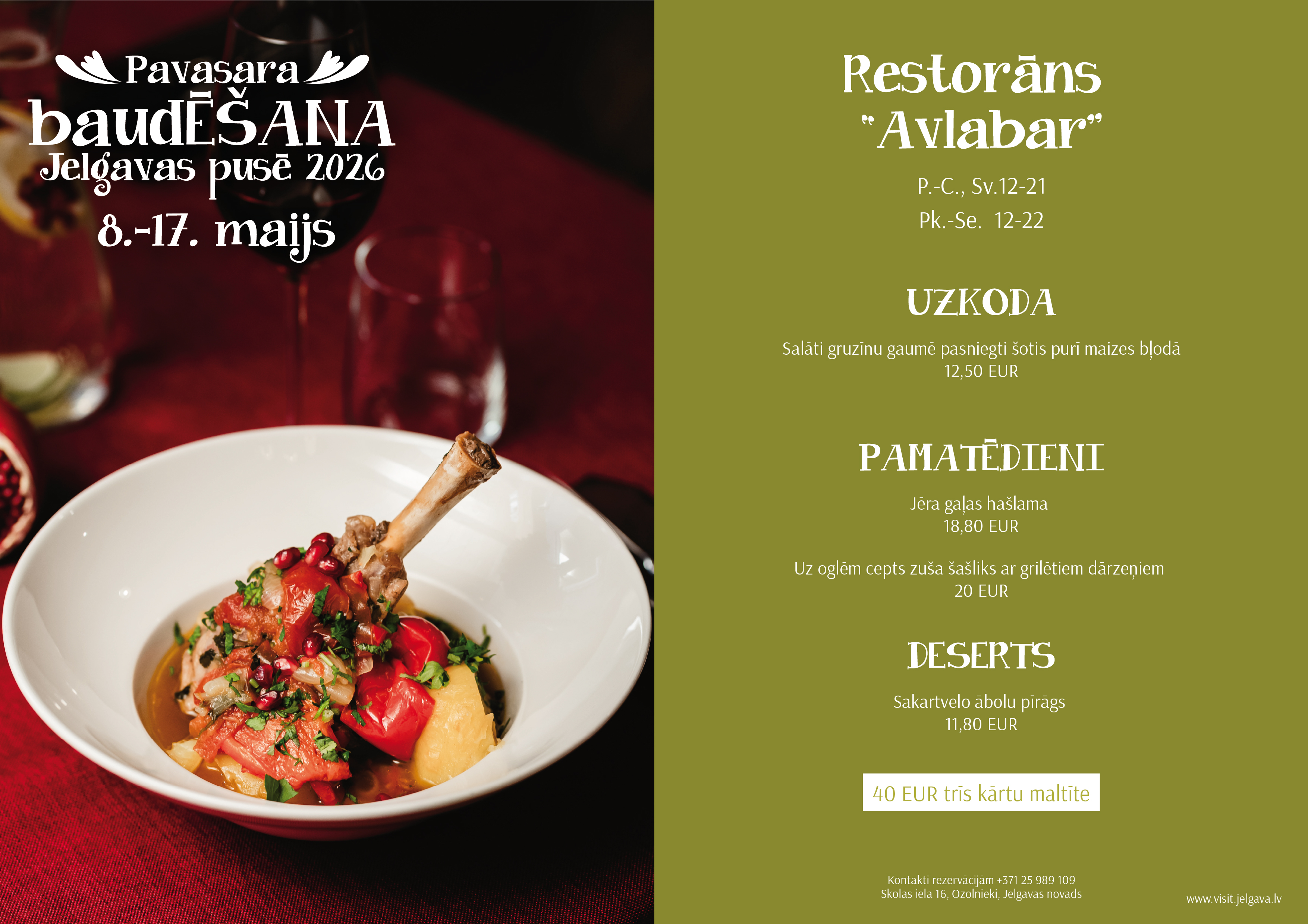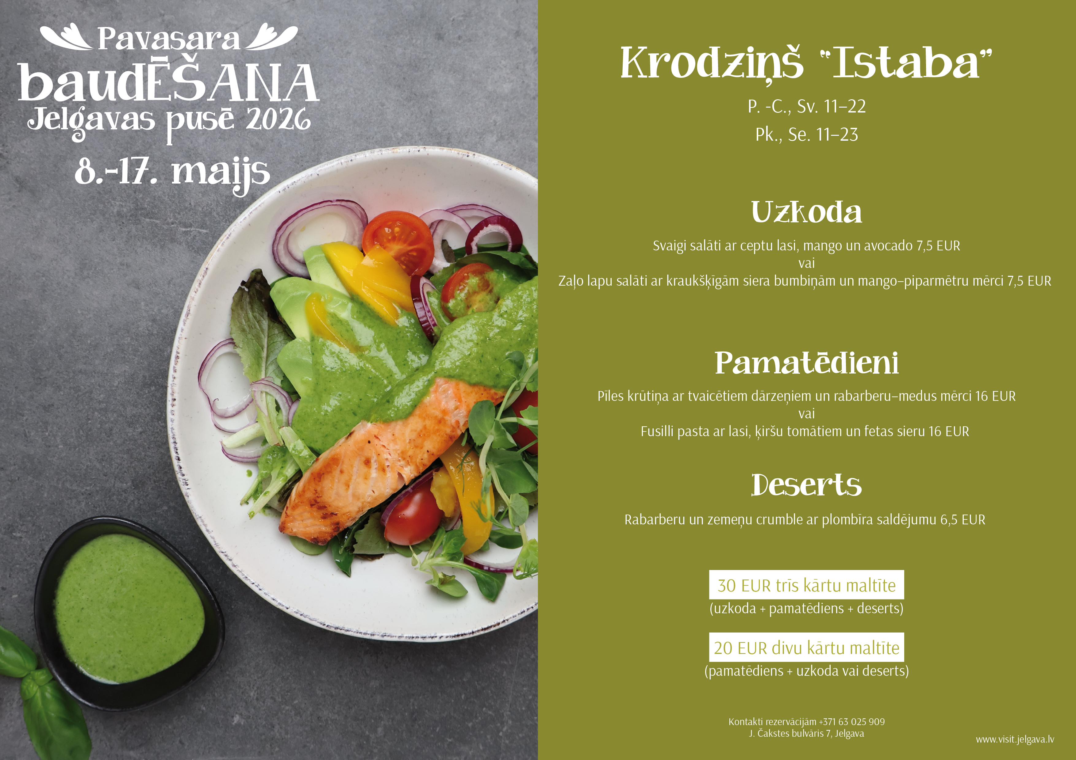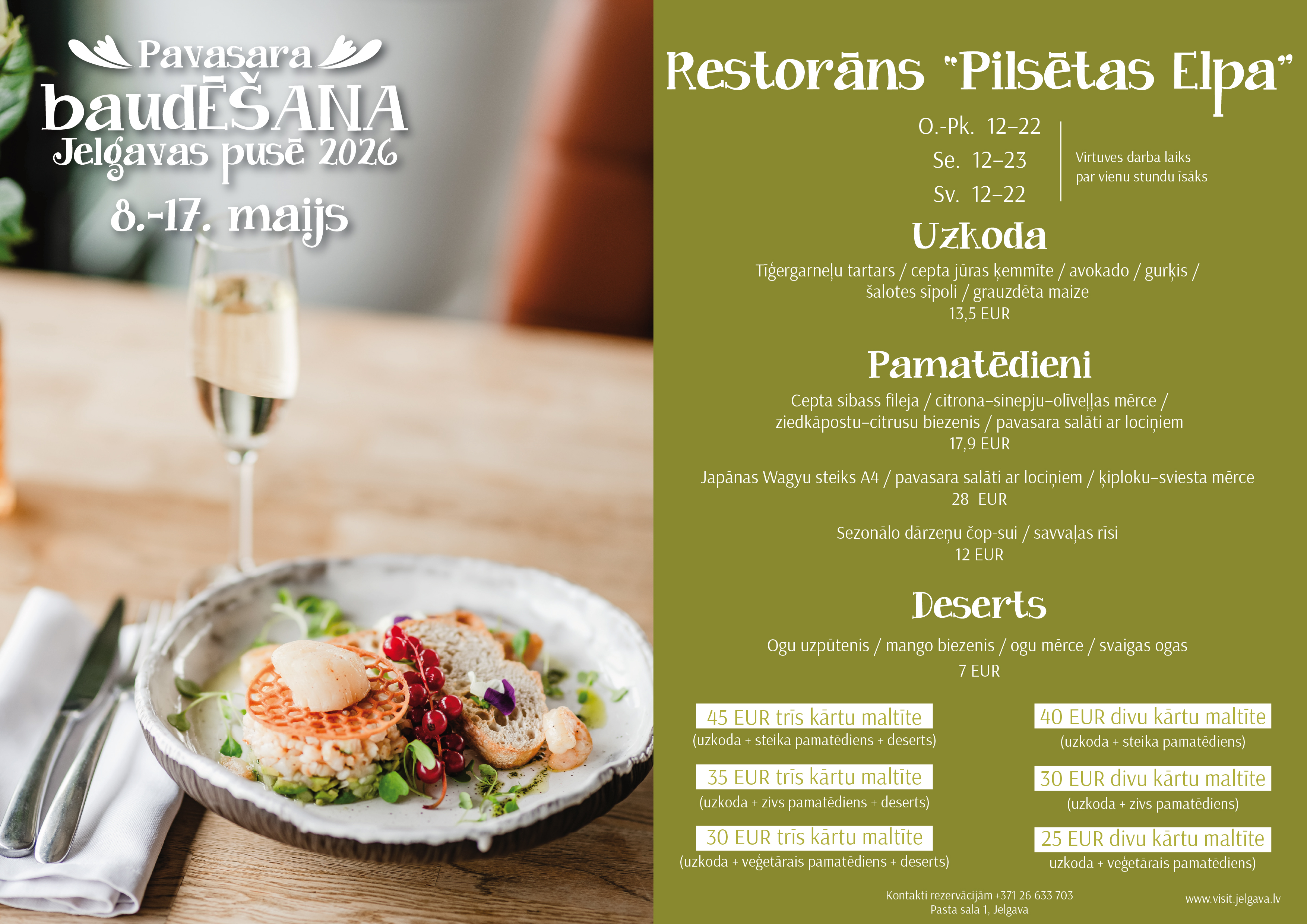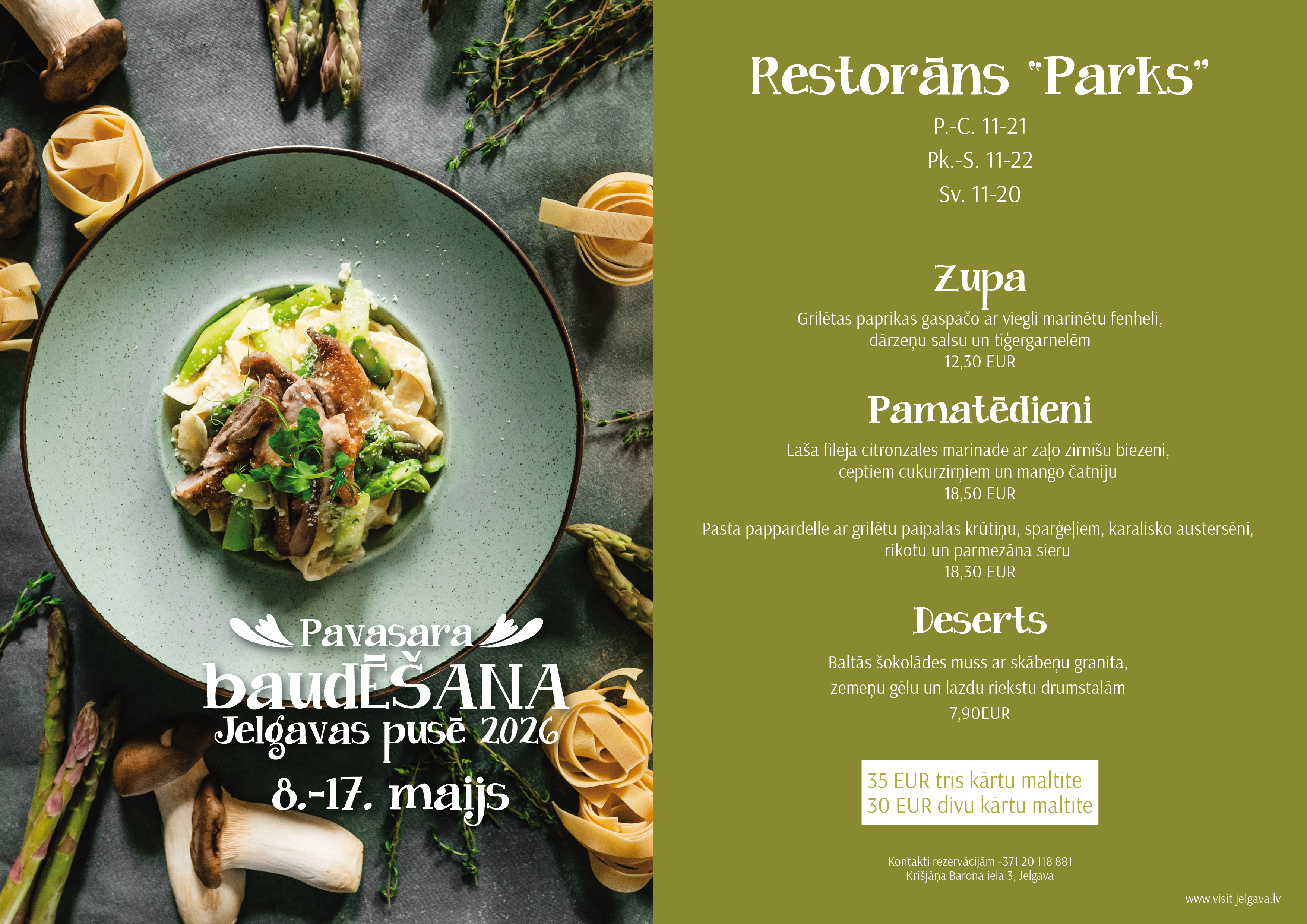 Akcijas “Pavasara baudĒŠANA Jelgavas pusē” dalībnieku darba laikus un ēdienkartes no 15. aprīļa atradīsiet mājaslapā www.visit.jelgava.lv, Visit.Jelgava Facebook un Instagram profilos, kā arī Jelgavas ēdināšanas un viesmīlības nozares asociācijas “Facebook” profilā Taste Jelgava un asociācijas mājas lapā www.tastejelgava.lv.