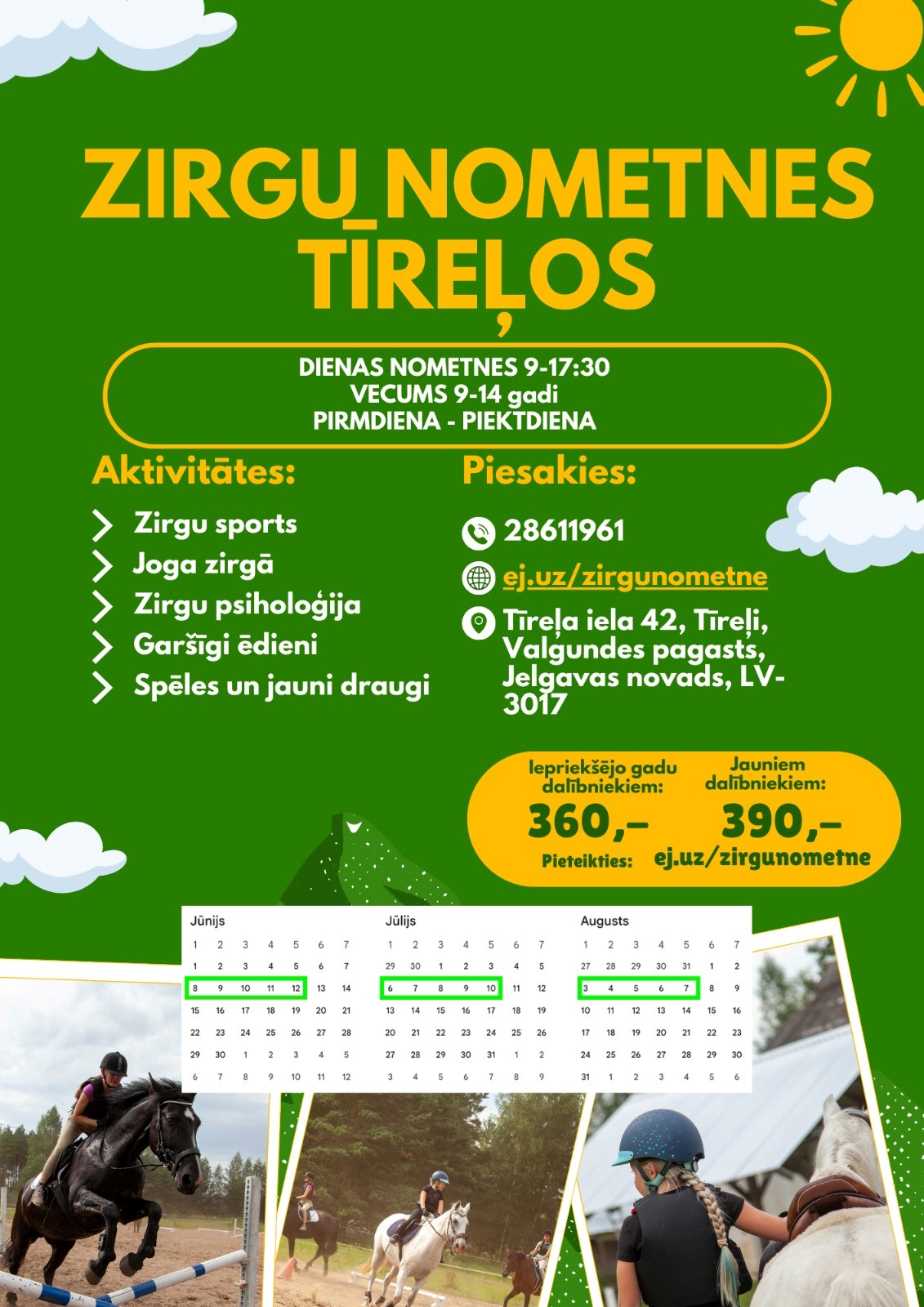 Oficiālas nometnes, sertificēts treneris, zirgi atbilstoši katra bērna pieredzei - var nākt ar un bez pieredzes, jautri piedzīvojumi, garšīgi ēdieni, jauni draugi un piepildīta vasara! Cena 390 EUR. Viss iekļauts: apmācība, ēdināšana, apdrošināšana. Iepriekšējo gadu dalībniekiem cena 360 EUR. Pieteikšanās: https://ej.uz/zirgunometne