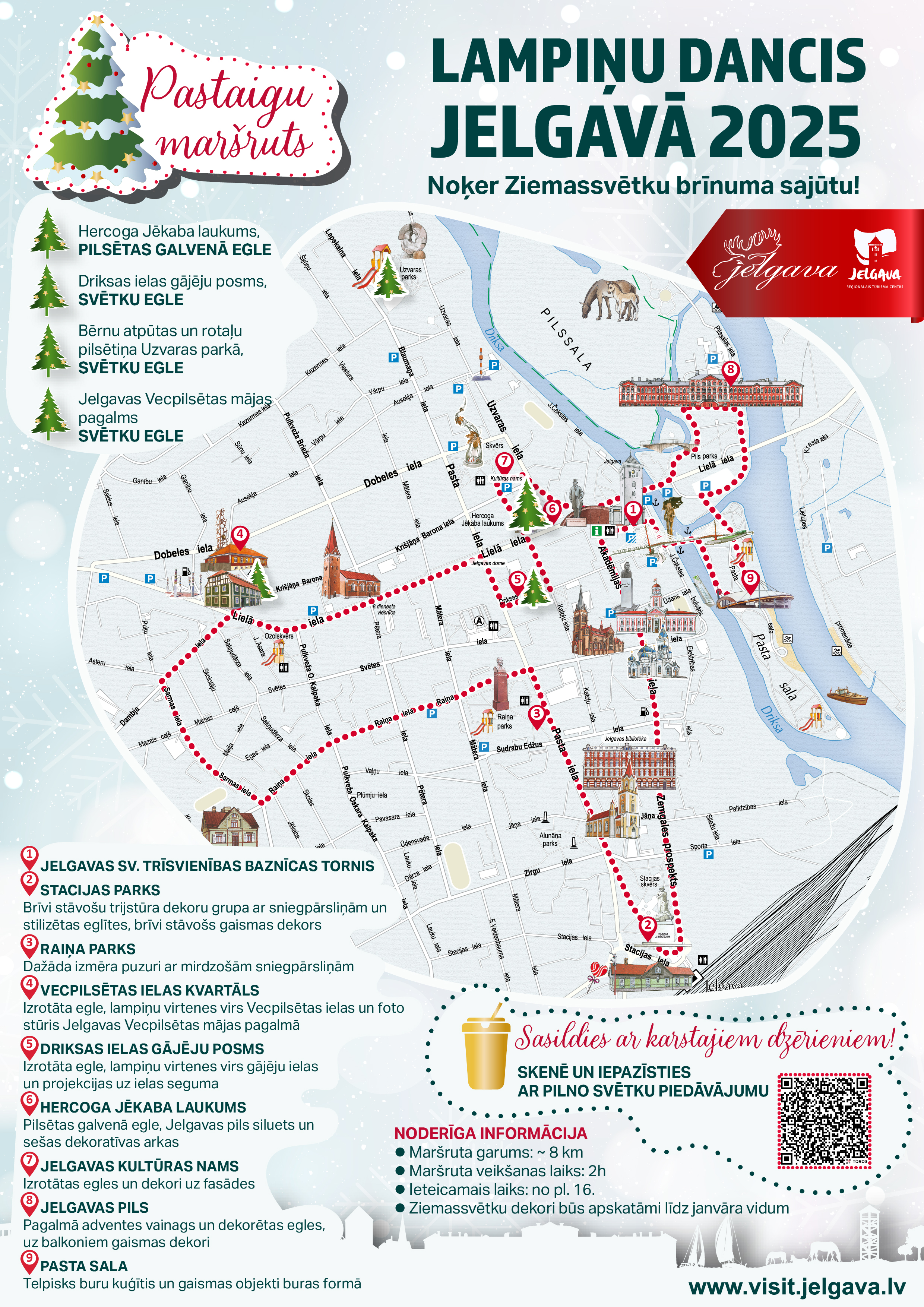 Lai ziemīgā pastaiga būtu vēl patīkamāka, 15 Jelgavas kafejnīcas un krodziņi piedāvā pa ceļam iegriezties un nobaudītu uz vietas vai līdzņemšanai kādu karsto dzērienu, piemēram, jāņogu-ingvera, smiltsērkšķu-apelsīnu plūškoka- greipfrūta vai meža ogu – ingvera.