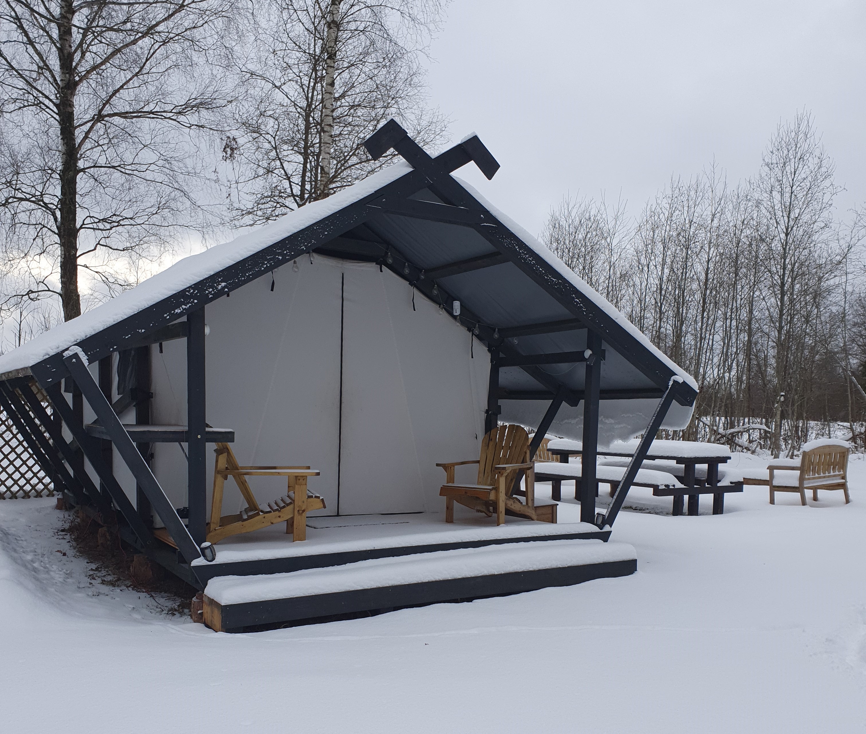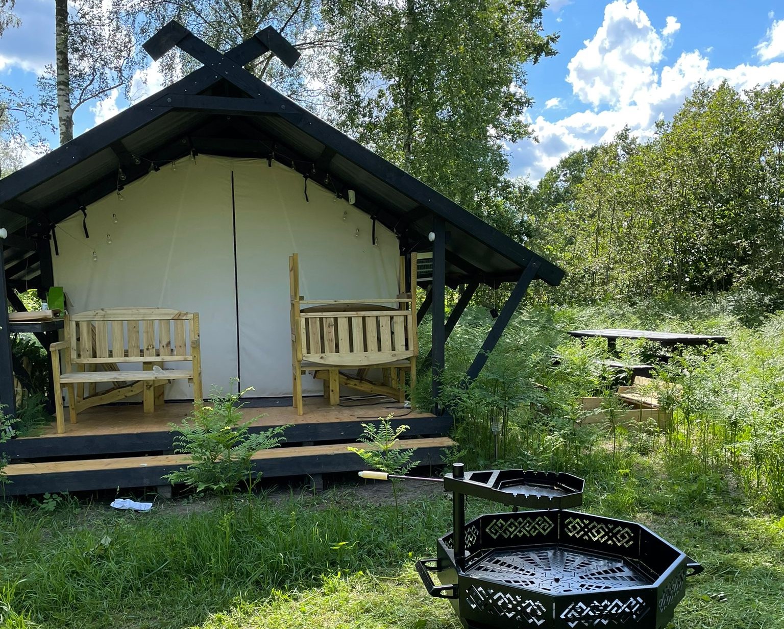 Outside the glamping, you will have access to an outdoor shower, a high quality Toi Toi toilet with water and disinfectants, a fire pit decorated with Latvian symbols and firewood with comfortable chairs around it for cooking or enjoying the evening, a table with chairs for eating, and a sandbox with toys.