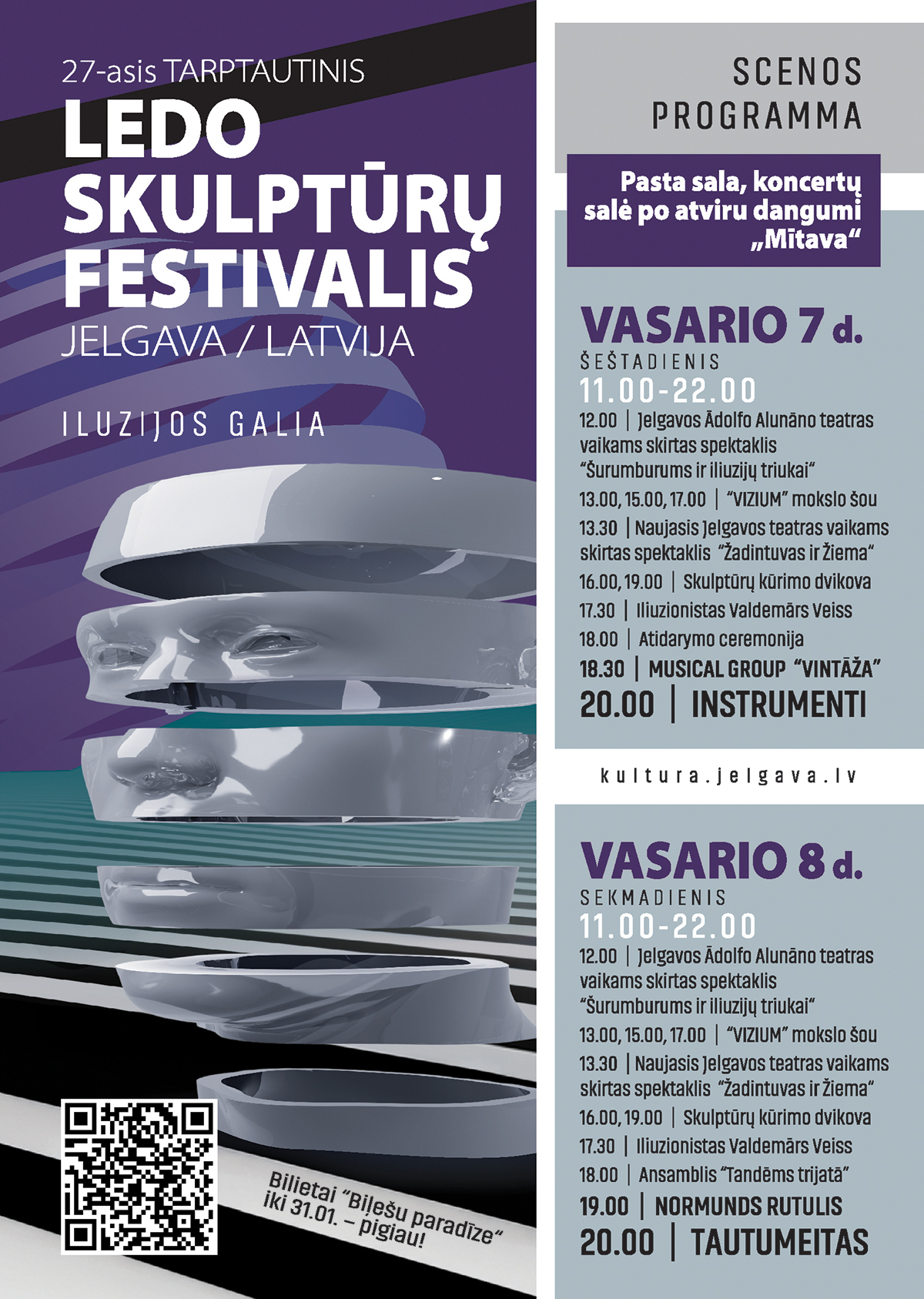 Vasario pradžioje Jelgava virs iliuzijų pasauliu – vieta, kur atsiskleidžia paslaptys, o nematoma tampa matoma. Čia susitinka realybė ir fantazija, susilieja tiesa ir apgaulė, o ledo skulptūros tampa tiltu tarp to, kas matoma, ir to, kas įsivaizduojama. 27-asis Tarptautinis ledo skulptūrų festivalis Jelgavoje kviečia pažvelgti už regimojo ribų ir patirti „Iliuzijos galią“ – temą, kurią lede įkūnys skulptoriai iš įvairių pasaulio šalių.