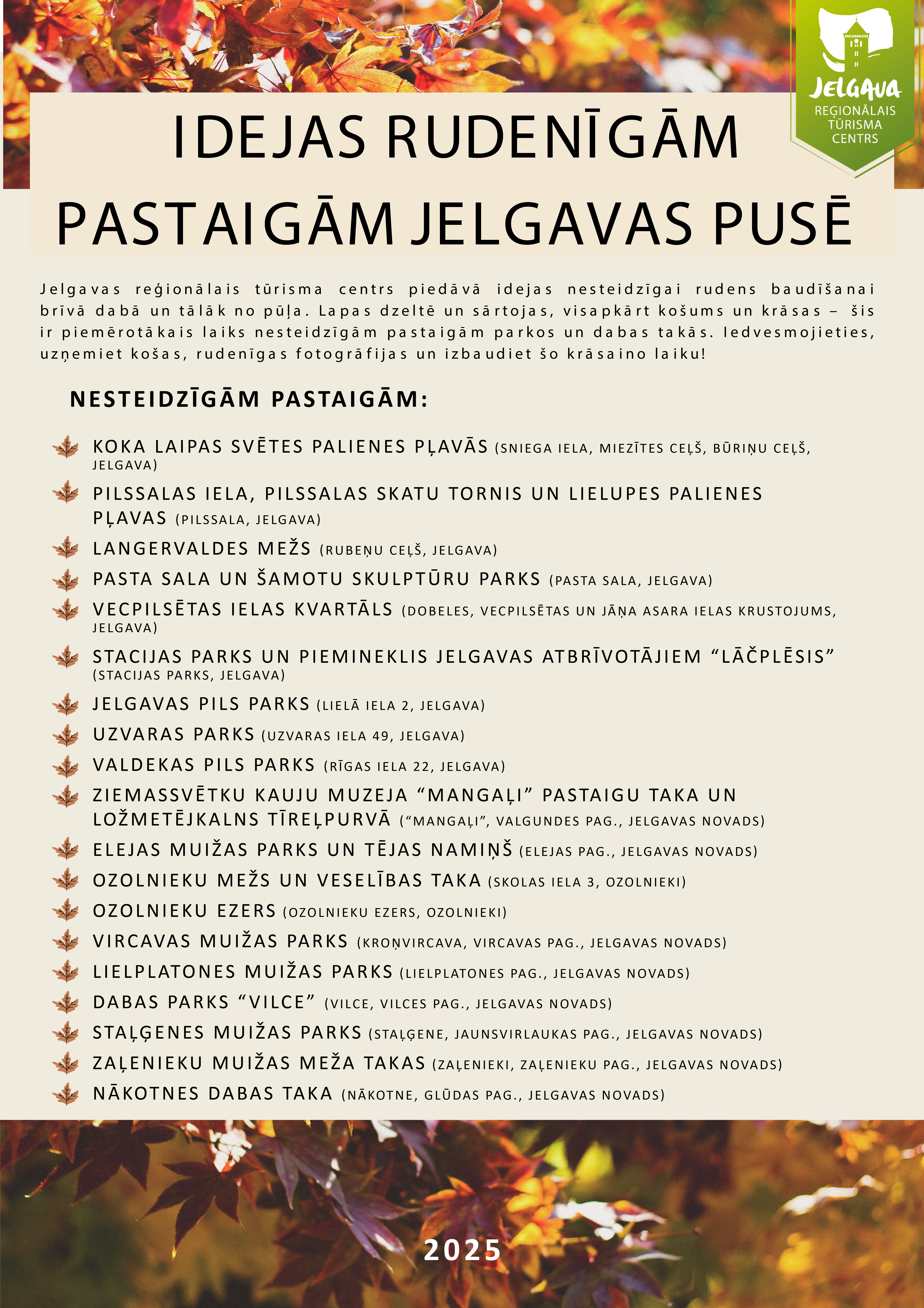 Jelgavas reģionāls tūrisma centrs piedāvā idejas nesteidzīgai rudens baudīšanai brīvā dabā un tālāk no pūļa. Lapas dzeltē un sārtojas, visapkārt košums un krāsas - šis ir piemērotākais laiks nesteidzīgām pastaigām parkos un dabas takās. Iedvesmojieties, uzņemiet košas, rudenīgas fotogrāfijas un izbaudiet šo krāsaino laiku!