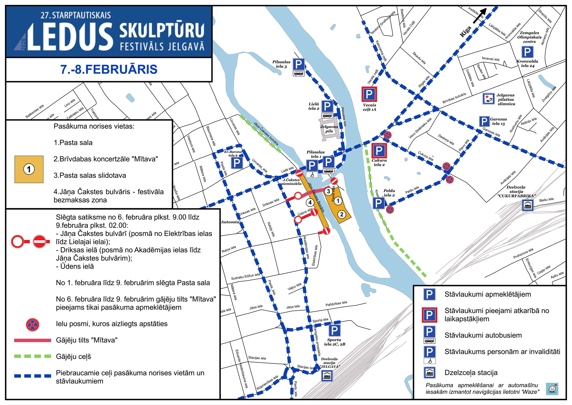 Gatavojoties pasākumam, pilsētā plānoti satiksmes ierobežojumi – no 1. februāra apmeklētājiem būs slēgta Pasta sala, atstājot piekļuvi publiskajai slidotavai, bērnu laukumiņam un restorānam “Pilsētas elpa”, bet no 5. februāra, uzbūves procesā, drošības nolūkos tiks ierobežota arī bērnu laukumiņa un slidotavas zona, atstājot piekļuvi restorānam. Skulptūru izveides un dažādu tehnisko darbu laikā – no 6. februāra pulksten 9 līdz 9. februāra pulksten 2 – būs slēgta satiksme Jāņa Čakstes bulvāra posmā no Raiņa ielas līdz Lielajai ielai, Driksas ielas posmā no Akadēmijas ielas līdz Jāņa Čakstes bulvārim, kā arī Ūdens ielā.