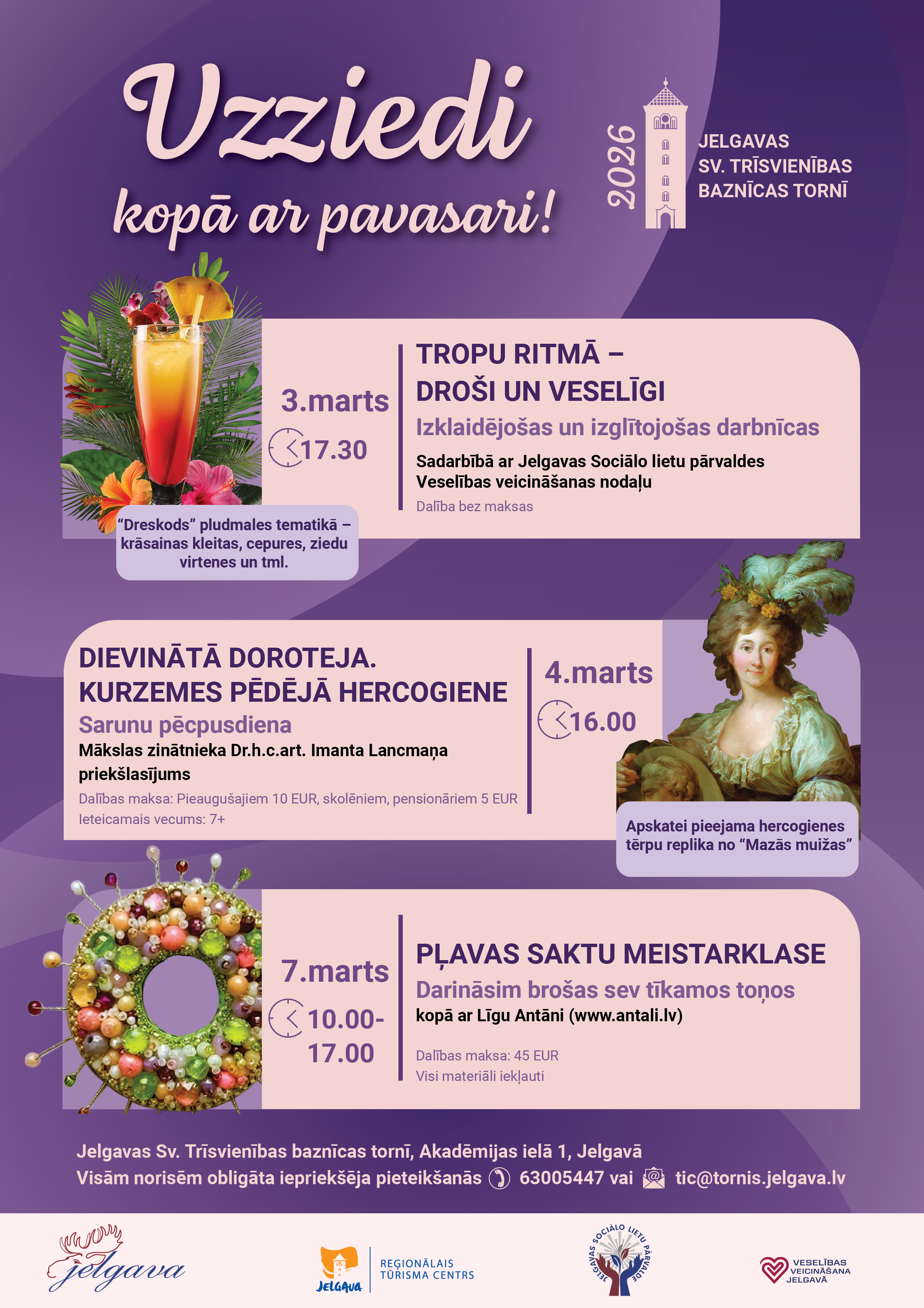 Visi minētie pasākumi norisināsies Jelgavas Sv. Trīsvienības baznīcas torņa konferenču zālē, Akadēmijas ielā 1. Dalība visās aktivitātēs tikai ar iepriekšēju pietiekšanos, tāpēc interesenti aicināti savlaicīgi pieteikt savu dalību pa tālruni 63005447 vai e-pastu Šī e-pasta adrese ir aizsargāta no mēstuļu robotiem. Pārlūkprogrammai ir jābūt ieslēgtam JavaScript atbalstam, lai varētu to apskatīt..