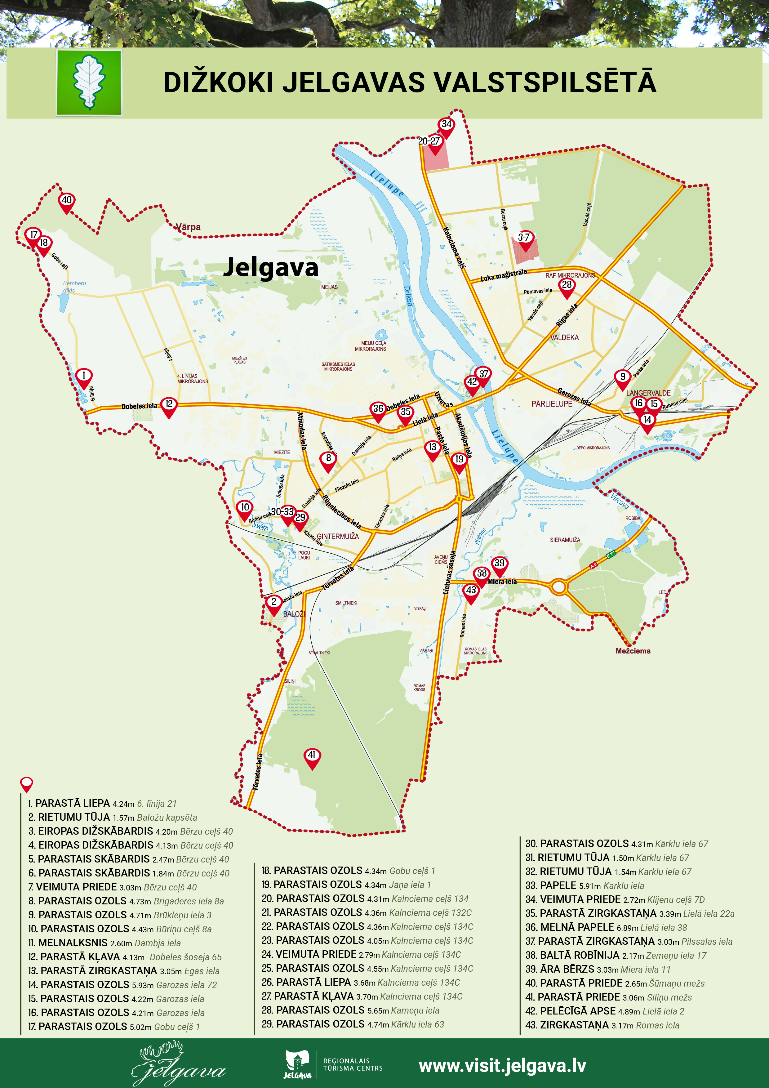 Karti ar atzīmētām dižkoku augšanas vietām Jelgavas valstspilsētā var aplūkot šeit.